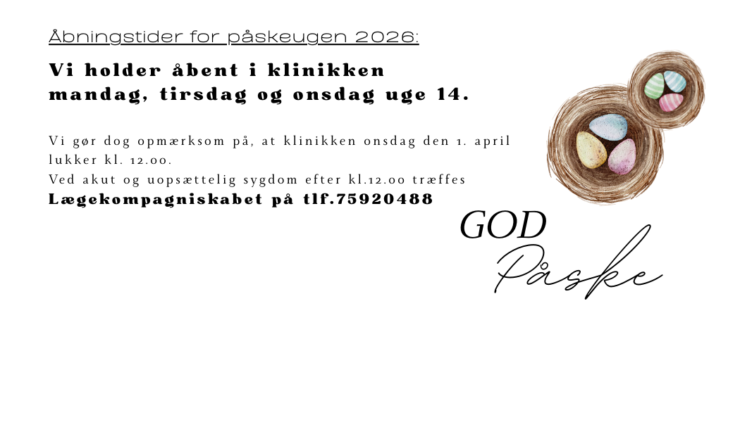 Her kan du stille enkelte og konkrete spørgsmål til lægen/sygeplejersken og sekretærerne. Vi bestræber os på at svare indenfor 5 hverdage.